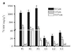该团队在前期发现土壤微生物具有可观的碳同化能力的基础上,运用同位素连续标记技术结合分子生物学技术,对土壤自养微生物光合同化碳的层次分布与传输进行了进一步的深入探讨,发现土壤不同层次间的14C-SOC量随着土壤深度的增加而显著减少。第三层5-17cm的底层土壤,有近1/4的土壤未检测到14C的存在,这可能与仅土壤表层很薄的一层能接受光能的原因有关。这说明土壤微生物的同化作用只发生在表层土壤,但是表层同化碳可以向下传输,传输能力因土壤而异,而且向下传输的同化碳,可能也为底层的化能自养微生物提供碳源和电子供体,从而在一定程度上可能诱导化能自养微生物参与碳同化过程。而且,不同层次间的土壤碳同化关键酶RubisCO酶活性、关键功能基因cbbL数量均随着土壤深度的增加而显著减少,并且稻田土壤的RubisCO酶活性、cbbL功能基因数量显著亦显著大于旱地土壤。该研究深化了我们对土壤微生物光合同化碳的生物地球化学过程机理的认识。