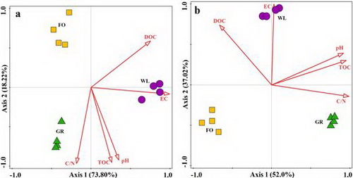 基于此,该团队在前期农田土壤微生物潜力及其功能种群研究的基础上,选取了三种不同生态系统的自然土壤(湿地、林地和草原生态系统),通过整合14C同位素标记技术和微生物分子生态学技术(克隆文库、T-RFLP及定量PCR),量化了上述三种自然土壤的固碳速率,同时探讨了其固碳功能微生物的种群结构、数量与多样性及其对不同土壤的响应与反馈机制。结果表明,这三个自然生态系统的土壤微生物的CO2固定能力不同,15天的碳同化量为10.3 - 40.1 mg kg-1之间,表现为湿地土壤>草地土壤>森林土壤。同时,cbbL(核酮糖-1,5-二膦酸 羧化酶/加氧酶(二磷酸核酮糖羧化酶)大亚基)丰度、14C-SOC和14C-MBC呈显著的正相关,表明自养细菌参与了土壤的CO2同化。含有cbbL的细菌的微生物在这三种自然生态系统中均广泛存在,且IA型和IC型的cbbL功能基因丰度在湿地土壤中含量最高,其次是草地土壤,而森林土壤则只存在IC型的cbbL功能基因。本研究还表明,固定二氧化碳自养菌和一氧化碳氧化菌多样性随着土壤类型而显著变化,但是根据系统发育分析,含有cbbL的细菌和含有coxL(一氧化碳脱氢酶大亚基)的细菌群落相似。主成分分析表明,土壤C/N比和EC值是影响土壤微生物固碳速率和cbbL、coxL基因丰度和多样性的主要环境因子(图1)。该研究深化了我们对自然生态系统土壤微生物固碳生物学机制的认识。