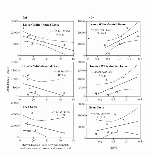 基于此,中国科学院亚热带农业生态研究所洞庭湖湿地生态研究团队以洞庭湖越冬的优势物种-三种食草雁类为研究对象,通过遥感、地理信息系统和野外调查,分析三种食草雁类种群数量变化及其生境变化的关系,发现退水时间(苔草完全裸露至三种雁类基本完全到达洞庭湖的时间间隔)和苔草生长状况是三种食草雁类种群变化的关键因子,三种食草雁类种群数量变化与退水时间呈显著负相关,而与苔草生长状况(NDVI)呈显著正相关。与豆雁相比,小白额雁和白额雁种群数量变化对生境变化的反应更加敏感。本研究结果可为人为干扰(尤其是三峡工程)下的长江中游雁类保护和湿地保护与管理提供理论依据。相关论文发表在Regional Environmental Change。
