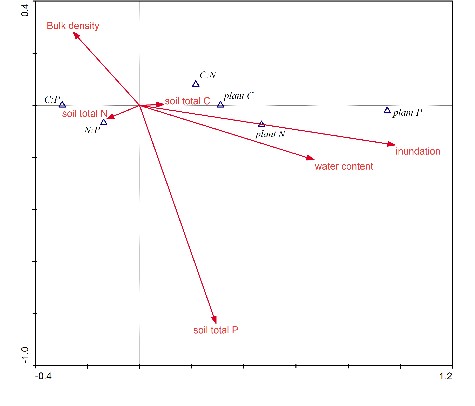 (2)不同演替阶段三种典型湿地植被(虉草、短尖薹草和荻)群落特征及土壤理化性质存在明显差异。植被总氮顺序为短尖薹草>虉草>荻,总磷为荻>虉草>短尖薹草。氮磷比以虉草群落最高,而其他两个物种无明显差异。相关分析表明,植被生态化学计量特征与土壤理化性质,尤其是土壤含水量及土壤总氮含量存在明显相关性;
