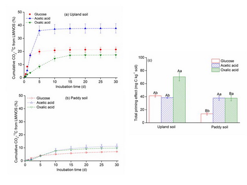 基于此,中科院亚热带农业生态研究所博士研究生邱虎森在苏以荣研究员和葛体达研究员的指导下,采用同位素示踪技术定量研究了不同小分子外源碳(葡萄糖、乙酸和草酸)在亚热带红壤性水田和旱地土壤中的主要矿化和转化产物差异(CO2和MBC),研究发现,在培养期内,外源小分子有机碳在淹水稻田土壤中的累积矿化量比在旱地土壤中的累积矿化量低2-3倍。微生物对葡萄糖碳的固定量远大于对羧酸碳的固定量。相关性的结果发现厌氧环境限制了真菌分解有机碳的活性,导致稻田土壤较低的矿化速率和微弱的激发效应。我们结合结构方程模型构建了在稻田与旱地土壤中有机碳矿化速率与生物及非生物因子之间的关系,模型结果发现在旱地土壤中,细菌量的增加促进土壤有机碳矿化速率的增加。而淹水稻田土壤中真菌/细菌比值的增加抑制了土壤有机碳的矿化速率。而环境温度与土壤通气性通过改变微生物群落结构和限制其活性,导致稻田比旱地更利于有机碳积累。