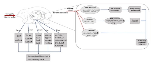 中国科学院亚热带农业生态研究所畜禽健康养殖中心的科研人员经过长期研究,探讨了动态饲喂色氨酸对生猪母子一体化机体健康、繁殖性能和生长发育的影响,揭示了分娩前日间高水平色氨酸施喂对子代产生负面影响的作用机理。利用转录组学技术对新生仔猪肝脏组织的生物标记物质进行了筛选,发现了88个差异表达的基因。转录组学功能性分析发现,细胞毒性调控、NADH氧化、ROS代谢物和组织发育等过程与色氨酸及其代谢物对新生仔猪氨基酸和脂肪酸代谢、肝脏抗氧化性能和机体生长发育的调控密切相关。这些发现为新生动物研究新生动物受到外部刺激状态下肝脏和血液的变化提供了新的生物标记物,同时也为研究肝脏和ROS代谢的生物过程变化提供了新的思路。