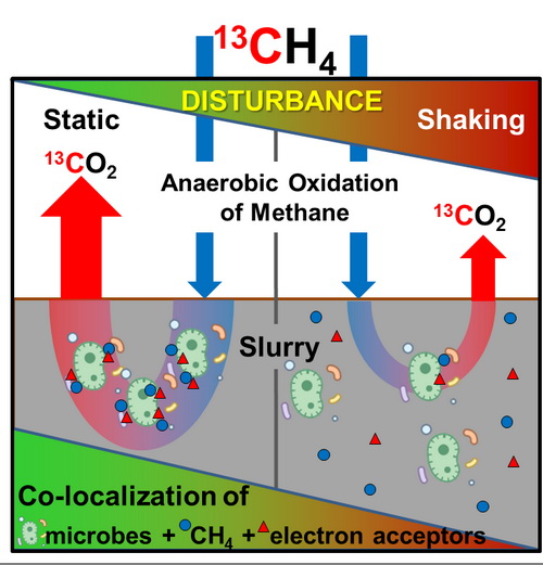 图2 基于同位素13C标记技术展示摇荡与静态培养条件对甲烷厌氧氧化的影响机制