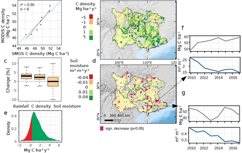 论文第一作者童晓伟博士、Martin Brandt博士在王克林研究员、岳跃民研究员指导下,与丹麦哥本哈根大学地理系Rasmus Fensholt教授团队、法国环境与气候科学实验室(LSCE)Philippe Ciais教授团队、中科院遥感与数字地球研究所张兵研究员团队等合作,将区域生态评估的学科前沿与喀斯特生态恢复的国家需求相结合,集成长时间序列光学遥感影像、微波遥感影像、高分辨率遥感影像(2m,10000余景)、机器学习算法及林业清查与统计数据,发展了基于林地出现概率及人为干扰持续时间、幅度、速率与方向的不同管理措施下区域植被景观类型(老林/天然林、自然恢复、人工造林、毁林、人工林采伐与迹地更新等)遥感识别模型,量化了不同恢复管理措施的固碳效应及其差异。研究发现在不同恢复管理措施下,西南地区森林覆盖(高度≥5米)由1982年的21%增加到2016年的38%,2002-2017年西南地区植被地上生物量固碳速率为0.11±0.05PgCy-1,其中新建林的贡献达32%,抵消了该区域过去6年人类化石燃料燃烧CO2排放的33%;老林/天然林面积仅占8.8%,但固定了研究区20.5%的碳,是相对稳定的碳库;2002-2017年自然恢复(面积5.4%)和人工造林(面积7.4%)的固碳速率分别达0.01 PgCy-1和0.021PgCy-1,对整个区域碳吸收的贡献率分别为14%和18%;研究区2017年的木材产量是2003年的3倍,但人工林采伐区域的植被生长依然贡献了约16%的碳汇。同时,研究发现8%的区域土壤水分显著下降,且土壤水分降低的热点区域主要集中在大规模人工造林的区域。