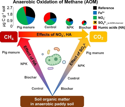 稻田是湿地生态系统中最重要的甲烷排放源之一,也是AOM发生的热点场所。同时,稻田受到高强度的田间管理干扰,使其土壤物理化学生物特征与自然湿地存在显著差异。为了探究稻田土壤中的AOM发生机制,中国科学院亚热带农业生态研究所吴金水研究团队联合德国哥廷根大学,利用同位素示踪技术对不同施肥(不施肥,施用猪粪肥,生物炭和氮磷钾肥)的稻田土壤,添加不同电子接受体(Fe3+, NO3-, SO42-和humic acids)进行厌氧培养。结果表明,添加NO3-使AOM速率增加了20-90%,但其在生物炭处理下与不施肥处理无显著差异;AOM速率在猪粪肥处理下最大,其次是不施肥,氮磷钾肥和生物炭处理最低。添加Fe3+使AOM速率在对照和猪粪肥处理下显著降低,但生物炭和氮磷钾肥处理下的AOM速率无显著差异。添加SO42-使AOM速率显著降低了5-51倍,但生物炭处理与对照相同。Humic acids使AOM速率降低了25-256%。本研究首次证明了有机电子受体(humic acids)是仅次于NO3-作为AOM的重要驱动力,在稻田土壤中至关重要(图1)。而且,施用畜禽粪肥会在短期内增加土壤碳库和促进温室气体的排放,但长期施用畜禽粪肥会减少温室气体的排放。本研究表明,氮磷钾肥处理下甲烷的排放量是不施肥的3.2倍,而猪粪肥和生物炭处理下的甲烷排放量与不施肥处理无显著差异。由于AOM速率在猪粪肥处理下的稻田土壤中最高,因此,在稻田的可持续管理中,应考虑长期施用畜禽粪肥,有助于减少甲烷的产生和较高的AOM,从而减少甲烷的排放。根据本文的AOM速率估算全球稻田AOM将有约3.9TgCyr-1的甲烷消耗量,大约是全球稻田甲烷排放量的10-20%。尽管这个估算带有很大的不确定性,因此需要更多的研究来进一步确定AOM作为稻田中甲烷汇的贡献性。该研究可为深入解析稻田减排潜力及稻田甲烷关键过程提供理论基础和数据支撑。