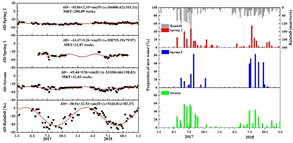 泉水和溪流水平均滞留时间估算(左)和新旧水补给比例的季节性变化特征分析(右)