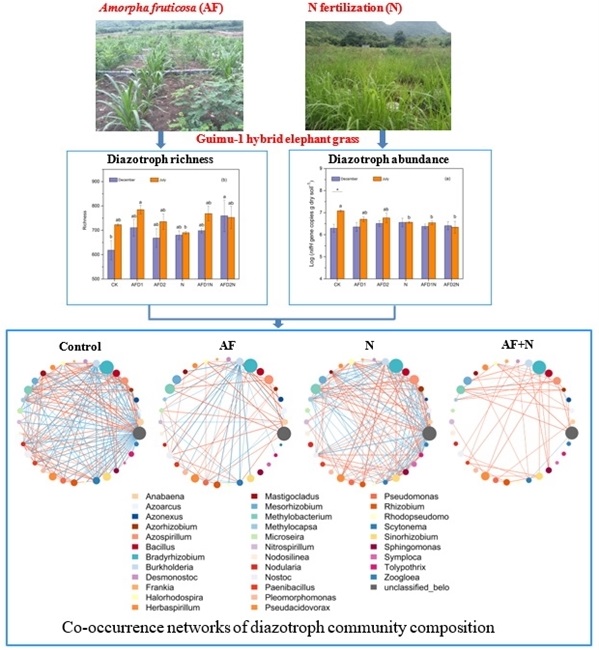 固氮菌作为生物固氮过程的执行者,对土壤氮素供给和土壤生态功能维持具有重要作用。在区域氮沉降水平日益增加和牧草地不合理氮肥施用的背景下,豆科灌木引种在喀斯特退化草地生态恢复和人工草地可持续管理方面具有巨大应用潜力。然而,喀斯特草地土壤固氮菌对不同外源氮输入方式的响应仍不清楚,限制了喀斯特自然草地生态系统恢复潜力评估和人工牧草地优化管理。