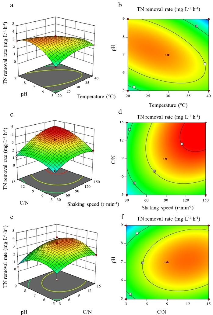 菌株WT14在不同环境条件下的TN去除3D和2D响应面模型