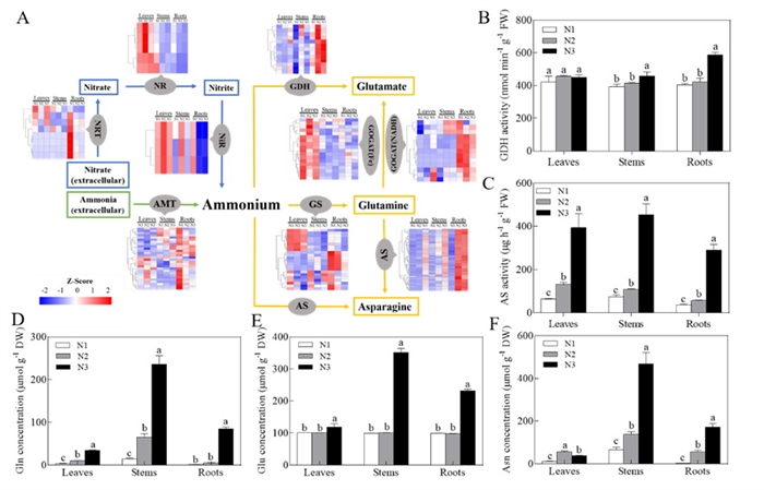 图一 不同铵条件下(N1:0.2 mM; N2:10 mM; N3:70 mM)氮代谢路径中差异表达基因热图和关键同化产物含量