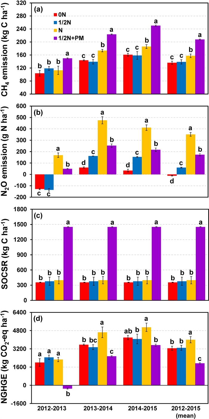 2012-2015年稻田CH4和N2O年累积排放量、土壤有机碳年固持量(SOCSR)和温室气体净排放量(NGHGE)。0N:无氮肥处理;1/2N:化学氮肥减少50%处理;N:100%化学氮肥处理;1/2N+PM:化肥减量配施猪粪处理