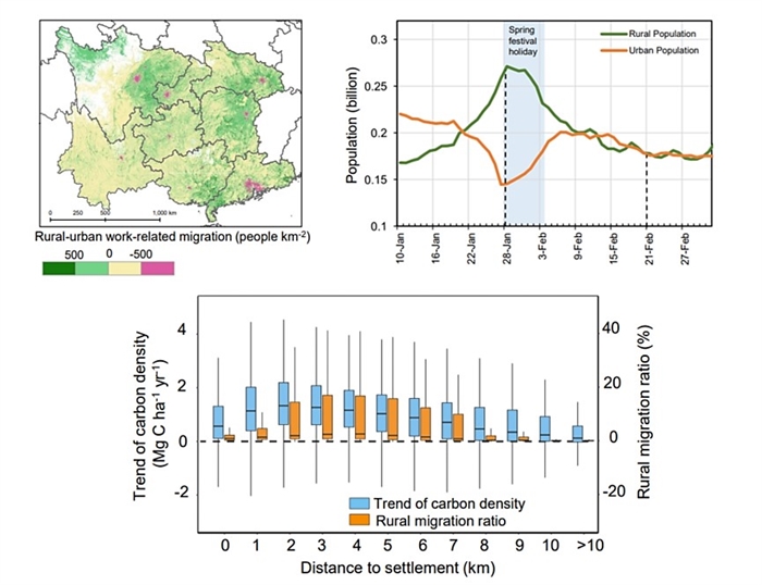 研究也发现由于中国城乡二元户籍制度的影响,传统人口普查统计数据可能会高估农村地区的实际人口压力程度,进一步以中国“变绿”的热点区——西南喀斯特区为例,利用春节期间的手机定位大数据实时量化了大规模城-乡人口流动的时空差异,发现随着农村外出流动人口比例的增加、植被地上生物量碳密度的增加趋势显著,进一步验证了农村人口压力减少越明显的地区植被恢复固碳越显著。