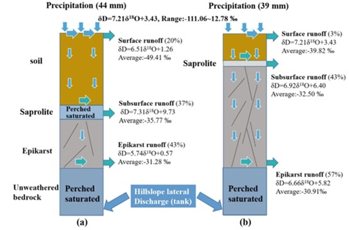 中国科学院亚热带农业生态研究所环江喀斯特生态系统观测研究站陈洪松课题组依托木连小流域喀斯特关键带地表-地下三维监测平台,结合自然水文监测和氢氧稳定同位素示踪技术,分析了降雨和地表-地下径流的相互关系及其对植物根区水源的影响,并进一步揭示关键带结构对径流产生的影响机制。