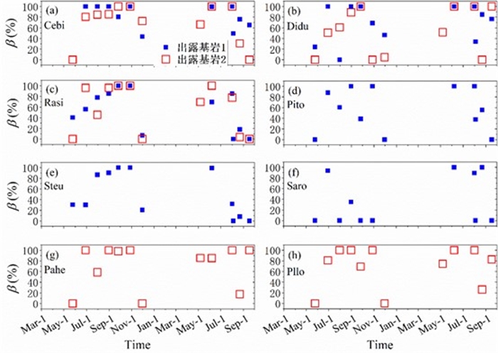 图3 出露基岩生境8种植物根区水分补给比例(β)季节动态
