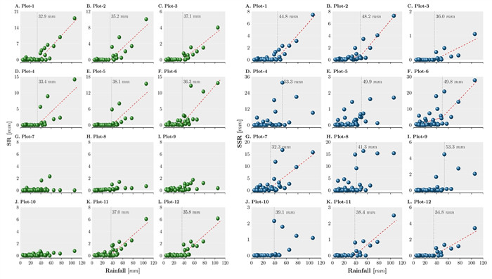 在降雨和地表-地下径流关系方面,以不同关键带结构的12个三维监测小区(5 m×20 m)为研究对象,监测了43场自然降雨事件的径流特征。据统计,监测期内日降雨量介于2.2~105.6mm,最大小时降雨强度范围介于1.0~42.6mm h-1(平均为13mm h-1),大于岩土界面稳定入渗率的降雨仅1场(42.6mm h-1)。与模拟降雨试验结果类似,自然降雨条件下喀斯特坡地地表产流少(平均径流系数:2.2%)。当降雨量大于45mm时,地表径流机制由“蓄满”向“超渗-蓄满”转变,并且随雨强的增加,“超渗”逐渐占主导。表层岩溶带径流的平均径流系数为31.2%,远高于壤中流(平均径流系数:3.8%)和地表径流的径流系数,是喀斯特坡地水量平衡的主要组成部分。表层岩溶带重要的水文调节功能凸显在旱季长期无雨且地表径流和壤中流断流情况下依然能维持稳定的供水。用分段模型分析降雨和径流的非线性行为(即阈值行为),结果发现,与非喀斯特地区不同,喀斯特坡地存在多种降雨-径流阈值关系类型(图1)。通过结构方程模型,分析径流和环境因子(土壤深度、碎石含量、植物根系长度、裸岩率)的相互作用,发现土壤厚度是影响地表径流的一级控制因素,在陆面水文过程模型中应该引起重视。