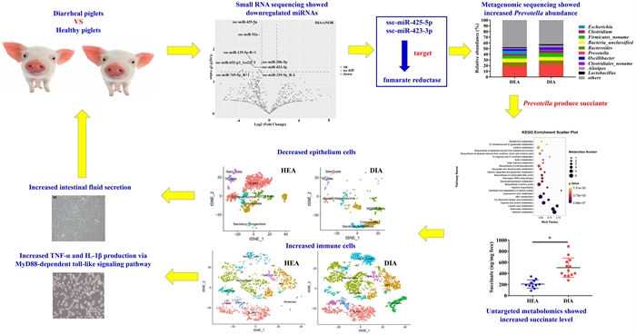 在全球畜禽养殖业逐步禁用促生长抗生素背景下,腹泻防控成为断奶仔猪饲养管理的重中之中。然而,仔猪腹泻的诱因复杂多样,相关分子机制尚有待解析。中国科学院亚热带农业生态研究所印遇龙院士团队近期研究发现,断奶应激导致腹泻仔猪的肠道微生物、代谢物和miRNAs组成均发生显著改变。其中,ssc-miRNA-425-5p和ssc-miRNA-423-3p的缺失导致Prevotella菌属丰度增加,且其富马酸还原酶表达升高,因此产生的琥珀酸在肠道内富集。单细胞测序数据提示,腹泻仔猪结肠上皮细胞功能受损,炎症反应增强。体外实验进一步研究发现,富集的琥珀酸一方面通过调节氯离子分泌而导致肠上皮细胞分泌增多,另一方面通过激活MyD88依赖的TLR4信号通路增加肠道炎症反应。总之,miRNAs表达减少导致微生物产生的琥珀酸在肠道内过量富集,进而促进肠道分泌和炎症反应,从而引起腹泻。该研究进一步丰富了仔猪腹泻的发生机制,为腹泻防控提供了理论依据。