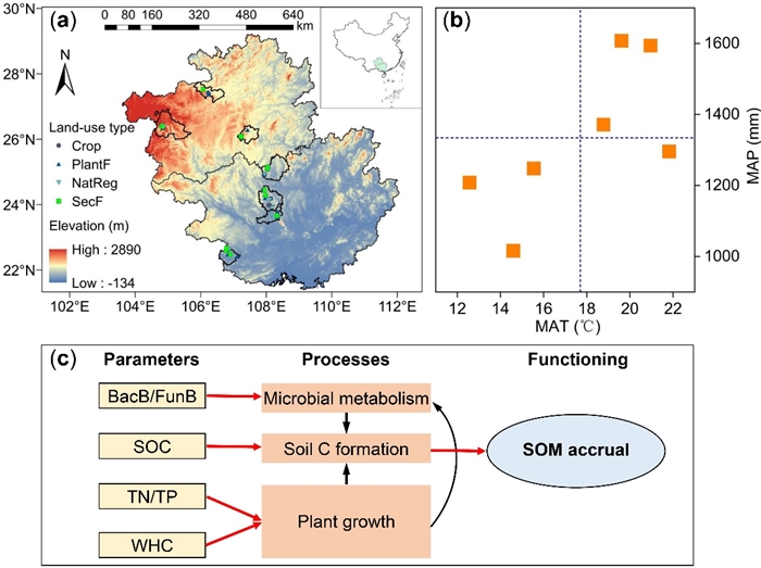土壤有机碳形成影响碳汇、生态系统多功能性以及陆表系统对气候变化的响应和反馈。在高强度耕作扰动向大规模植被恢复转变背景下,喀斯特区损耗的土壤有机质库逐渐恢复,可利用资源的变化也影响地下微生物群落。然而,植被恢复如何影响微生物群落结构和功能以及这种变化是否会进一步影响土壤有机质积累,目前尚不清楚,制约喀斯特生态系统碳汇潜力评估以及高效固碳增汇人工干预技术研发。