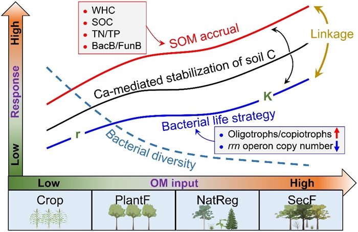 结果发现,人工林和自然恢复林土壤有机质自然增长量显著高于耕地(分别增加47%和60%),但仍低于次生林。同时,植被恢复降低了土壤有机质及相关指标对区域温度变化的敏感性;植被恢复后,富钙土壤提高了碳库稳定性,降低了细菌多样性,促进细菌群落由r-策略转向K-策略;而K-策略主导的细菌群落促进了土壤有机质积累,在维持土壤固碳功能高水平运作时其协同关系尤为紧密。