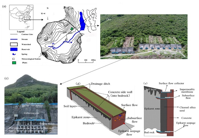 近期,中国科学院亚热带农业生态研究所环江喀斯特生态系统观测研究站王克林和张伟团队依托以上喀斯特坡地关键带多界面三维水土过程监测平台(4个处理,3个重复,共计12个小区),连续3年(2018-2020)同步观测土壤-表层岩溶带系统内地表径流、岩土界面壤中流、表层岩溶带侧渗等多界面产流过程及可溶性碳流失过程,解析了喀斯特关键带结构因子(裸岩率、土厚、土厚变异系数、表层岩溶带厚度、表层岩溶带风化程度、基岩起伏度、土壤质地等)与土地利用方式(自然恢复灌丛、牧草、经果林、传统玉米)对喀斯特关键带多界面水文过程和可溶性碳流失通量的影响。
