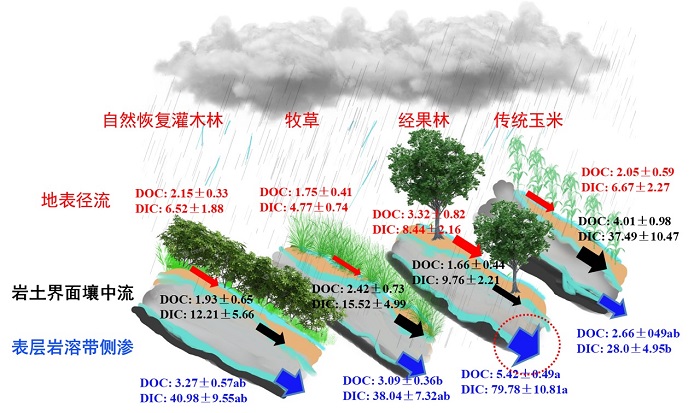研究结果表明(图2):1)从水量平衡结果看出,喀斯特坡地关键带水文过程表现出明显的以地下过程为主的特点:表层岩溶带侧渗(70%)、岩土界面壤中流(27%)、地表径流(3%)。整体而言,随着人为利用强度的增加,喀斯特坡地地下水补给量显著降低,地表径流和岩土界面壤中流等浅地表横向径流逐渐增加,从而降低了土壤-表层岩溶带系统的水文调蓄功能,加剧了旱涝灾害风险。2)土层厚度、基岩起伏度、土壤质地是控制喀斯特关键带多界面DOC和DIC流失通量的最重要的关键带结构因子。土层较厚且土壤-表层岩溶带平整接触的岩土系统更容易触发浅地表横向径流驱动的可溶性碳损失。土地利用对喀斯特关键带多界面产流及可溶性碳的控制作用远小于关键带结构因子的影响,然而,与传统玉米耕种及经果林种植等高强度利用类型相比,保护性牧草种植表现出显著的减少径流、降低碳损失的保水固碳效果。3)极端降雨事件导致喀斯特坡地关键带多界系统中的可溶性碳流失量高达平水年总流失量的2.5倍,极端降雨事件是喀斯特地区关键生源物质流失的关键防控期。本研究为全球变化背景下喀斯特关键带生源要素流失阻控和水土资源可持续利用提供了科学依据。