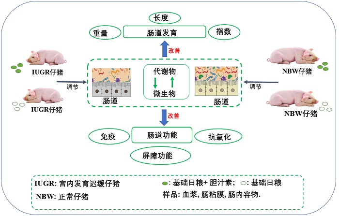 近期,中国科学院亚热带农业生态研究所畜禽健康养殖与农牧复合生态研究中心孔祥峰科研团队,通过比较研究不同日龄或生长阶段的正常体重猪和IUGR猪的生长发育、机体代谢和肠道微生态特征,并利用粪菌移植+无菌鼠等技术进行验证,发现IUGR改变了肠道菌群多样性及其代谢路径,导致肠道能量、氨基酸和胆汁酸代谢异常,阻碍了IUGR猪的后期生长发育。通过在日粮中添加胆汁酸试验发现,胆汁酸可提高IUGR仔猪的肝脏功能和肠道有益菌数量,缓解肠黏膜氧化损伤,还可以改善IUGR仔猪结肠黏膜的屏障功能和氧化还原状态,有利于维持肠道健康。上述研究表明,肠道微生物可作为调控IUGR的靶点,胆汁酸在改善IUGR猪营养代谢和维持肠道健康方面发挥了重要作用。