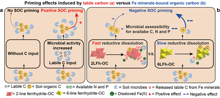 为此,中国科学院亚热带农业生态研究所吴金水研究团队以2线水铁矿和6线水铁矿(分别代表无定型和晶型铁矿物)及13C-葡萄糖为原料制备了四种碳铁复合物(包括2线水铁矿结合态高量、低量葡萄糖和6线水铁矿结合态高量、低量葡萄糖),并以高量、低量纯葡萄糖为对照,采用室内培养试验,在60天培养期内观测了稻田土壤碳铁复合物的矿化过程及对土壤原有有机碳矿化的激发效应。结果表明,2线水铁矿结合态葡萄糖的累积矿化率比6线水铁矿结合态葡萄糖高~21%。仅葡萄糖添加刺激了土壤原有有机碳矿化,形成了正激发(~0.27 % SOC),但碳铁复合物输入抑制了土壤原有有机碳矿化,引起了负激发(-0.33% ~ -0.55% SOC)。CO2的激发效应强度取决于于水铁矿结晶度,即:6线水铁矿结合态葡萄糖引起的CO2激发效应强度仅为2线水铁矿结合态葡萄糖的一半。这是由于:6线水铁矿的铁还原速率较慢,其结合的葡萄糖释放量少;6线水铁矿吸附了溶解性有机碳、铵态氮和有效磷等,加重了微生物碳源和养分限制,从而抑制微生物活性。CH4的激发效应与水铁矿结合的葡萄糖浓度高度相关,即:水铁矿结合态高量葡萄糖的CH4负激发效应强度弱于水铁矿结合低量葡萄糖。这是由于:水铁矿结合态高量葡萄糖的铁还原速率快,葡萄糖被释放量多,为产甲烷菌提供更充分底物。研究明确了铁矿物通过降低其结合的碳被矿化并诱导负激发效应(抑制土壤有机碳矿化),进而促进稻田土壤有机碳积累,且碳积累增强效应取决于铁矿物的结晶度以及碳负载量。因此,促进无定型铁矿物向晶型铁矿物转化,可增强富铁水稻土有机碳积累。研究结果有助于深入理解碳铁复合物促进南方红黄壤性水稻土有机碳积累的过程机制,并对该区域土壤肥力提升及田间综合管理等方面具有重要指导意义。
