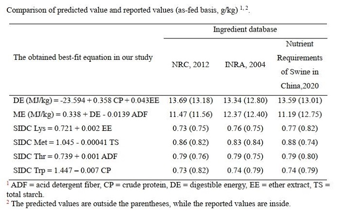 近3年,由中国科学院亚热带农业生态研究所印遇龙院士团队黄瑞林研究员主持的“生长育肥猪常用能量饲料原料营养价值评定与预测方程建立”项目,已先后完成并建立了木薯、大麦、高粱等70种饲料原料及144种试验日粮的化学成分数据库,并基于饲料原料有效化学养分含量构建了生长育肥猪有效能(DE和ME)和标准回肠氨基酸消化率(SID AA)的预测模型。该项工作的开展,对国内外饲料原料数据库的完善与构建具有重要意义。预测方程得到的预测值与RNC2012、INRA2004和《中国猪营养需要》(2020)等国内外数据库报道值的匹配度较好(见表1)。动态预测模型的建立,为快速评估未知饲料原料的营养价值提供了可行途径,也是生猪精准饲料配方制定的基础。