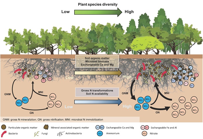 为探讨植物物种多样性对土壤有效氮水平的影响机制,中国科学院亚热带农业生态研究所李德军研究员团队以西南亚热带喀斯特森林生态系统为研究对象,选取45个植物物种多样性(香农-威纳指数)介于0.15至3.57的样方开展研究工作。结果表明,植物物种多样性显著提高了土壤有机氮矿化速率、硝化速率、微生物无机氮同化速率以及净氮矿化、净硝化速率。土壤供氮能力的提高促使有效氮水平沿植物物种多样性梯度显著增加。进一步分析表明,土壤初级氮转化速率受到土壤有机质和微生物属性的强烈影响。其中,土壤微生物量、微生物chiA基因丰度、细菌和古菌amoA基因丰度的增加是导致有机氮矿化速率、硝化速率沿植物物种多样性梯度显著增加的关键原因。而微生物无机氮同化速率的提高则与高植物物种多样性背景下土壤有机质的积累密切相关。该研究强调了植物物种多样性在调节土壤有效氮供应方面具有关键作用,并揭示了背后的机理。这些发现可以纳入到地球系统模型中,以更好地预测土壤氮可利用性水平和碳汇能力对植物物种多样性变化的响应。