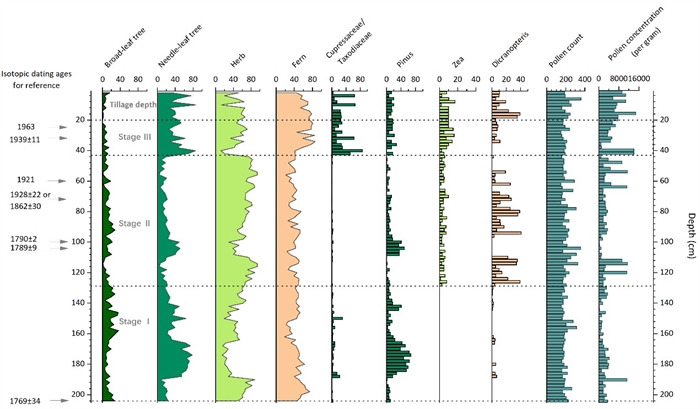 针对上述问题,王克林团队岳跃民研究员依托环江喀斯特生态系统观测研究站,初步开展了历史时期喀斯特区人类活动影响及森林演变工作。建立了基于喀斯特洼地沉积物测年的历史人类扰动识别方法,百年尺度利用137Cs和210Pbex定年,历史时期定年主要依据炭屑14C,首次在典型喀斯特洼地的沉积物开展孢粉学分析,并结合历史文献记载、当地调查,重建了过去三百年以来喀斯特地区“林——毁林——零星造林”的三个主要阶段:在1780年之前,针、阔叶树孢粉浓度很高,意味着当前石漠化区在历史时期可能曾经覆盖茂密的针阔混交林;1780年后以玉米花粉和先锋物种芒萁孢子的同时出现标志着生态环境的显著变化;自20世纪30年代起,该地区存在零星造林,以针叶树柏科/杉科花粉数量突增为主要特征。研究表明玉米引种、人口增长和移民,加速了山地开垦和森林砍伐,导致历史时期石漠化的发生,也是当前部分喀斯特区难以自然恢复成森林景观的重要原因,高强度人类扰动后的喀斯特区植被修复需要权衡林或非林。