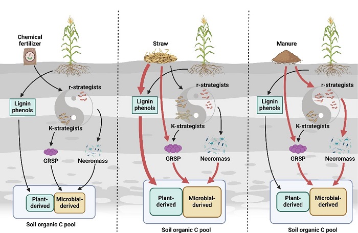 基于此,中国科学院亚热带农业生态研究所王克林研究员团队依托中国科学院环江喀斯特站旱地长期施肥试验平台,分别以氨基糖、木质素酚和球囊霉素为分子标志物,研究了不施肥、单施化肥、高低水平(30%和60%)秸秆和牛粪替代化肥6种不同施肥处理对土壤中植物源和微生物源碳的影响,并结合土壤微生物生活史策略,阐释了不同施肥对不同来源有机碳积累的影响机制。