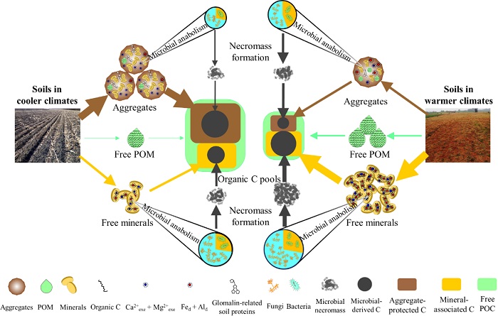 中国科学院亚热带农业生态研究所流域农业环境研究中心陈香碧研究员小组从我国东部四个气候带(中温带、暖温带、亚热带和热带)配对采集典型水田和旱地土壤样品,采用有机碳密度和粒径分级结合短期同位素示踪技术,量化了游离态颗粒有机碳、团聚体保护态有机碳和游离矿物结合态有机碳对土壤长期积累有机碳的贡献,分析了微生物合成代谢产物(微生物残留物)对团聚体保护态和游离矿物结合态碳库的贡献,浅析了南方和北方农田土壤有机碳保护机制。结果表明,团聚体保护态有机碳对全土有机碳积累的贡献从北到南减少,而游离矿物结合态有机碳的贡献率呈递增趋势,这主要是因为:1)北方土壤中交换性钙镁离子和球囊霉素含量高于南方,该活性离子和真菌代谢物促进了团聚体的形成;2)南方土壤中DCB提取态铁铝含量高于北方,该活性矿物提升了游离态矿物对有机碳的吸附能力;3)北方种植制度为一年1~2季,南方为2~3季,南方高频率的耕作破坏了土壤团聚体。微生物残体碳对游离矿物结合态有机碳的贡献率从北到南增加,这是因为南方高温高湿条件下游离态矿物中微生物残体碳的合成代谢强度高于北方。据此得出结论:我国东部北方农田土壤有机碳积累受团聚体保护主导,南方受矿物保护主导,且北方微生物合成代谢对有机碳积累的参与程度弱于南方。该结论对优化区域农田管理措施促进土壤有机碳积累和肥力提升有重要指示意义。