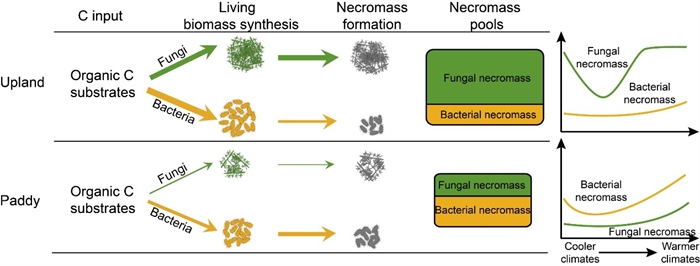 机理论证:采用短期18O-H2O示踪培养试验,监测土壤“老碳”的微生物代谢过程,发现:与旱地土壤相比,稻田土壤微生物的生长速率更高、呼吸速率更低,使得其土壤微生物碳利用效率更高。尽管如此,稻田较旱地土壤微生物对碳源的摄取效率低,表明稻田土壤有机碳转化和积累过程微生物参与程度较低。基于短期13C标记培养试验,监测微生物对“新碳”的合成代谢过程,发现:稻田土壤13C标记微生物活体碳含量是相邻旱地的38%~71%,进而引起稻田13C标记微生物残体碳含量是旱地的26%~55%,尤其是真菌残留物的含量远低于旱地土壤。因此,稻田较旱地土壤拥有更高的有机碳含量是由于其更弱的微生物碳摄取强度和代谢效率(图3)。
