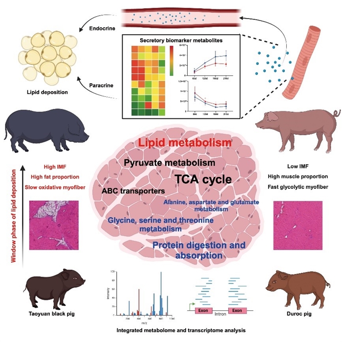 中国是世界上最大的猪肉生产和消费国。桃源黑猪原产于湖南省桃源县,是中国特有的脂肪型地方品种猪,与瘦肉型杜洛克猪相比,具有更高的肌内脂肪含量和慢肌纤维占比,以优良的肉品质著称,同时具有更丰富的外周脂肪沉积。调控桃源黑猪的脂肪沉积,在降低外周脂肪的同时提高肌内脂肪含量,具有较高的经济价值。同时,挖掘和利用我国地方猪种质资源,对实现种业振兴具有重要的意义。肌肉和脂肪组织同时是重要的代谢和分泌器官,肌肉和脂肪组织之间通过分泌因子进行对话,也被称为“肌-脂互作轴”。分泌型代谢物作为肌-脂互作的重要媒介,能够调控肌肉分化、代谢稳态和脂肪沉积。因此,桃源黑猪和杜洛克猪也是研究肌-脂互作机制和代谢性疾病的理想动物模型。