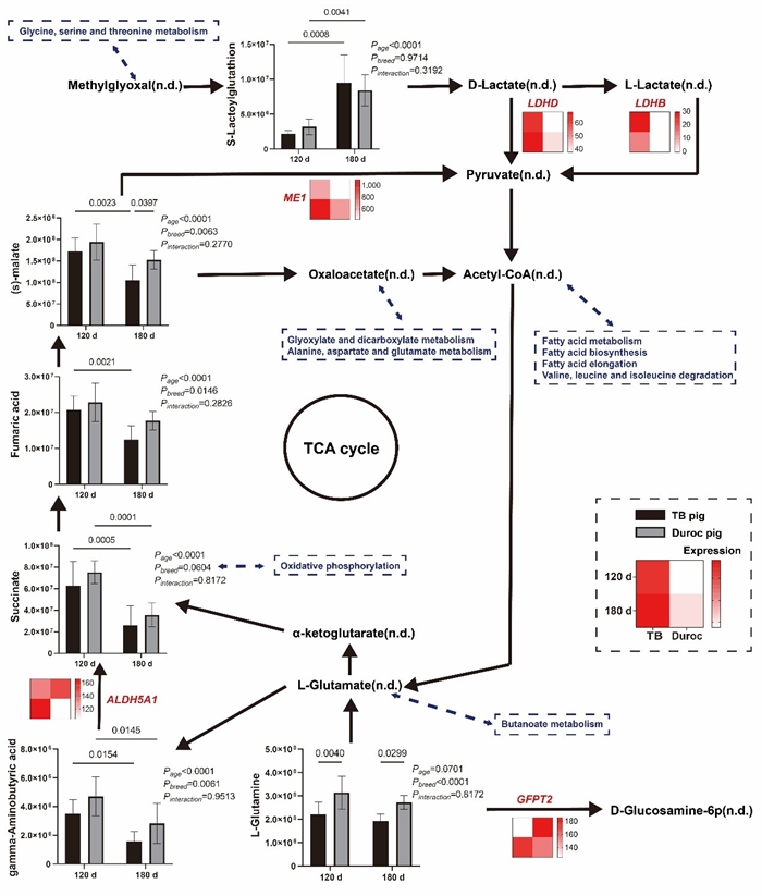 该研究通过对不同日龄桃源黑猪和杜洛克猪的背最长肌组织进行非靶向代谢组学分析,结合脂肪沉积表型数据,研究人员首先确定了桃源黑猪脂肪沉积和肉品质形成的“窗口期”为120至180日龄。代谢组与转录组联合分析揭示“窗口期”日龄与品种间背最长肌代谢差异主要富集在能量、脂质和氨基酸蛋白质代谢相关通路。随后鉴定了数十种180日龄桃源黑猪背最长肌的特异性代谢产物。