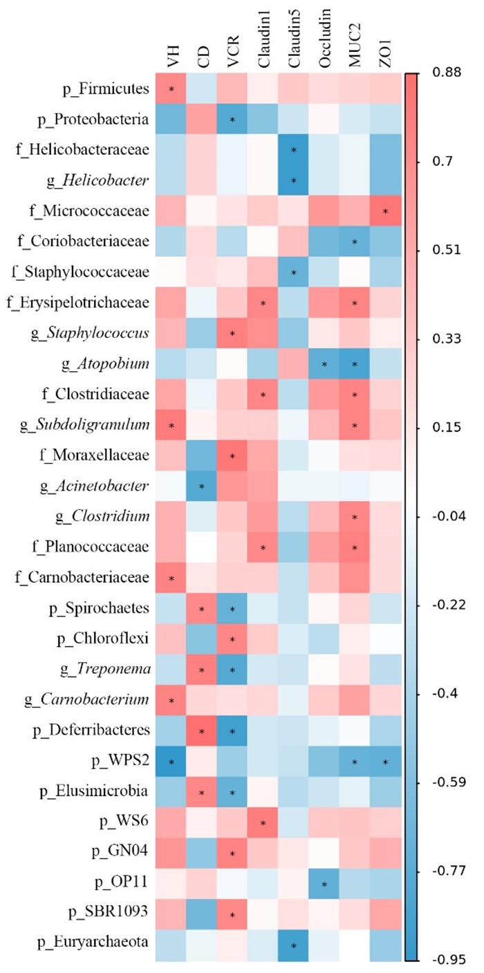 空肠微生物与空肠形态、物理屏障相关基因表达的相关性分析