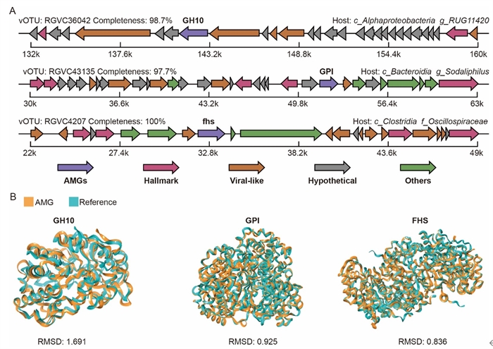 图4 对关键病毒辅助代谢基因的基因组背景和蛋白结构比对验证