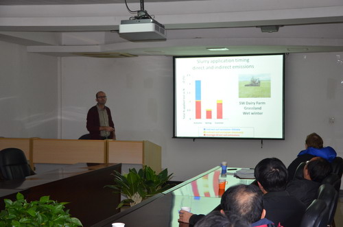 访问期间,Davey与Chadwick就作物-土壤系统病原菌、英国农业温室气体减排等领域的最新研究进展与该所研究人员及青年骨干和研究生作了深入的交流和探讨。并分别作了题为“Human pathogens in agricultural environments: risks and mitigation”与“Agricultural nitrous oxide emissions: research to improve the UK inventory”的学术报告。报告内容引起了参会人员的强烈兴趣并展开热烈讨论,报告结束后,两位专家与相关青年骨干、研究生就实验设计、论文撰写、数据整理与分析等方面开展了详细的讨论,听取了相关科研骨干的工作进展报告,并提出了报告建议与指导意见。