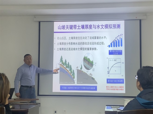 王仕琴作了题为“华北平原农区地下水硝酸盐来源及污染风险”的学术报告,介绍了华北平原地下水硝酸盐时空分布特征,指出山前冲积扇平原存在较高地下水硝酸盐污染风险,并解析了污染来源;建立了雄安新区重点区域水量水质实时监测网络,研发了水量水质监测预警技术,为华北地区地下水污染监测和风险评估提供了重要的科技支撑。彭韬作了题为“普定后寨河流域水沙迁移过程与来源的几点认识”的学术报告,分别从坡地和流域尺度解析了流域水沙迁移与来源机制,表明喀斯特地下空间具有明显的“储库效应”,并强调源地分类和示踪因子都需要在不同尺度进行构建;评估了探地雷达技术在喀斯特关键带结构探测方面的可行性与存在的挑战。刘金涛作了题为“山坡水文土壤学研究”的学术报告,从物理过程和数学模拟角度阐释了关键带土壤厚度预测理论和体系,并介绍了结合山地关键带土壤厚度的水文模拟;基于实验观测揭示了山坡关键带水文连通机制,以及土壤水分变化控制因素,发现非饱和水流运动是维系山谷湿润的关键。
