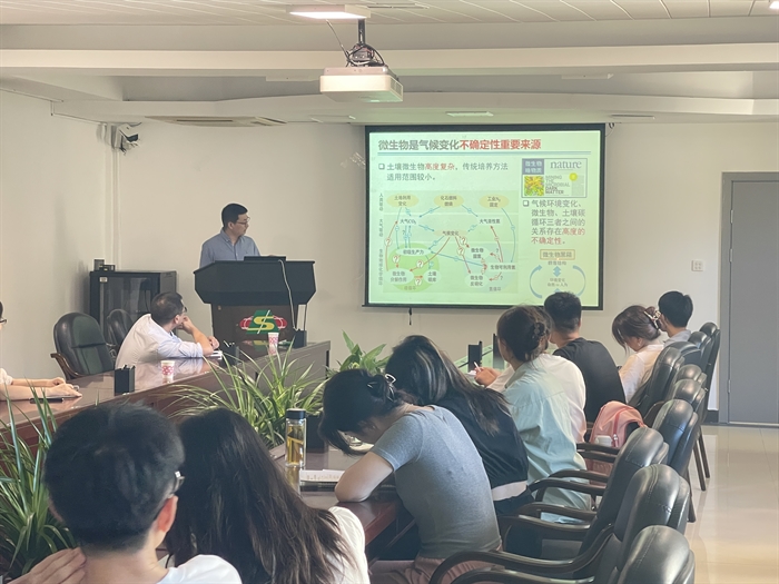 会上,郭雪以“全球变暖背景下土壤微生物的演替特征及碳转化机制”为题作了学术报告。郭雪系统介绍了全球气候变化的严峻问题,并强调微生物是土壤碳循环的主要控制者,也是气候变化不确定的重要来源。针对气候变化对生态系统的影响以及目前对土壤微生物与气候变化研究的不足,开展了对草原土壤微生物长期群落演替及其驱动机理、微生物群落功能变化特征及其响应特征、同时将微生物信息纳入碳循环模型等一系列研究并分享相关成果。郭雪就全球变暖背景条件下,不同区域土壤微生物所受影响可能存在一定差异等一系列内容与参会者进行讨论,并在将微生物纳入气候模型的重要性研究给出了合理的建议。
