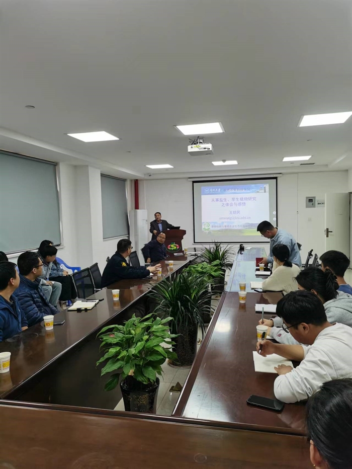 王锁民教授作题为《从事盐生、旱生植物研究体会与感悟》的学术报告,回顾了自己三十余年的科研工作经历,将自己科研生涯中相伴的四棵草与多个国家自然科学基金的联系作为切入点,提出了把科学问题聚焦生产实践,并将科研成果推广到生产一线为目的进行科研创作的见解。