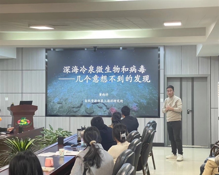 董西洋作了题为“深海冷泉微生物和病毒—几个意想不到的发现”的学术报告,介绍了冷泉微生物介导的元素地球化学循环,冷泉微生物和病毒的生态角色与进化规律等创新发现,并与参会人员进行了深入的交流与讨论。