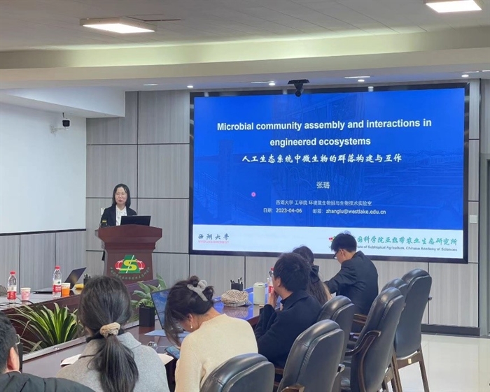 张璐作了题为“人工生态系统中微生物的群落构建与互作”的学术报告,主要介绍了其研究土壤等自然生态系统和污水处理人工生态系统中微生物的互作机制和微生物群落构建的驱动过程,发掘微食物网中的关键捕食性微生物,揭示了微生物捕食在调控群落结构和生态系统功能方面的应用。