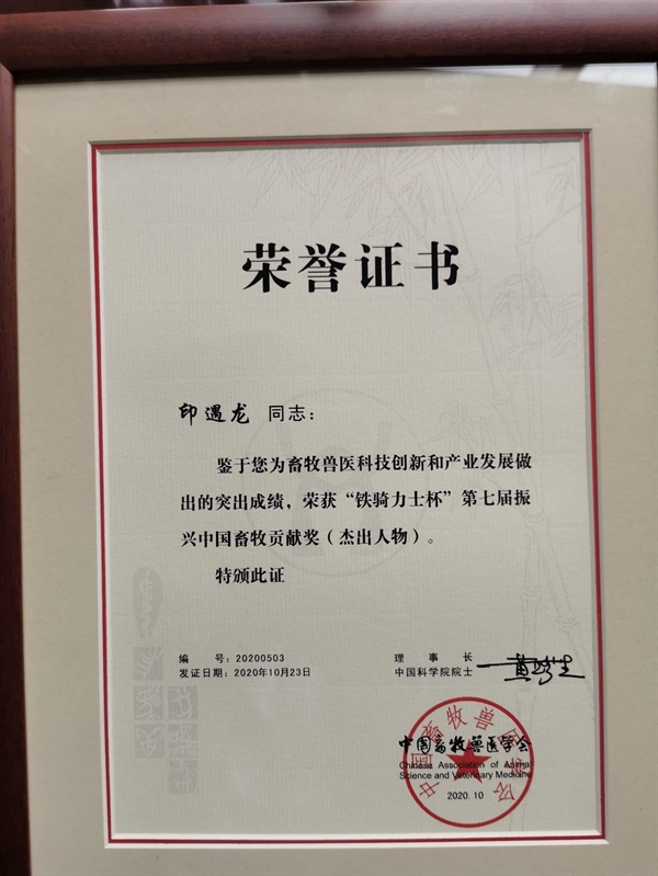 印遇龙获奖证书