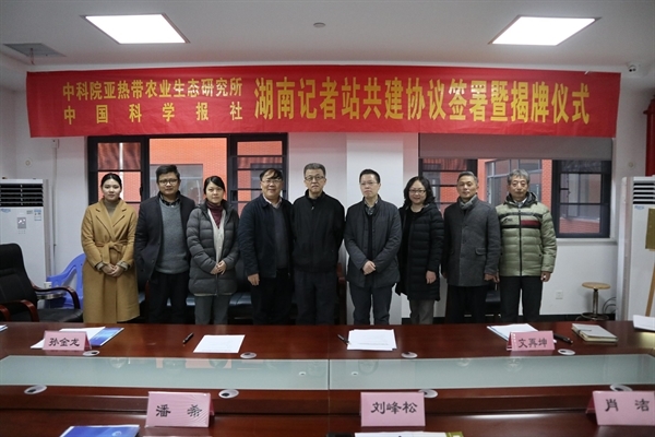 12月24日,中科院亚热带农业生态研究所与中国科学报社签订湖南记者站举行共建协议仪式暨座谈交流会在亚热带生态所举行。所党委书记王克林与中国科学报社党委书记刘峰松进行了现场签约并共同为记者站揭牌,湖南省委宣传部传媒监管处处长陈奇亮等应邀出席仪式。