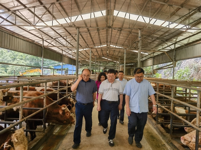 孙国吉(前排中)一行参观绿峯种草养牛示范基地(何寻阳摄)