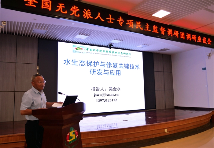 座谈会上,陈洪松向调研团介绍了研究所基本情况、成果产出和未来研究规划。吴金水研究员重点汇报了研究所在农业农村水污染源头治理关键技术创建及应用、洞庭湖湿地生态修复模式创新及影响等水生态保护与修复方面的工作进展,组织无党派人士和有关专家参与民主监督的情况,提出了有效改善水生态环境问题的建议。