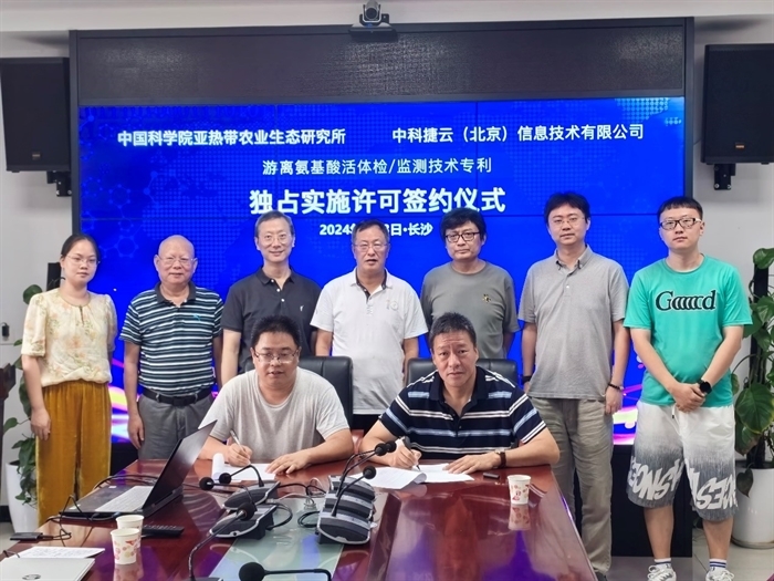 7月3日,中国科学院亚热带农业生态研究所印遇龙院士团队与中科捷云(北京)信息技术有限公司(简称中科捷云)在长沙举行游离氨基酸检测技术专利独占实施许可签约仪式。中国工程院院士、亚热带生态所首席科学家印遇龙,科技管理与规划处处长刘守龙,畜禽健康养殖与农牧复合生态研究中心研究员黄瑞林、副研究员冯泽猛,长沙理工大学食品与生物工程学院教授曹忠,中科捷云董事长杨兰林,项目经理王文静,硬件研发工程师朱兵,长沙优企知识产权代理事务所周栋等出席。
