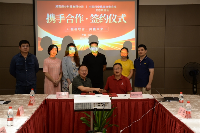 8月27日,中国科学院亚热带农业生态研究所印遇龙院士团队与湖南绿谷科技有限公司在长沙举行生猪养殖粪污资源化利用技术合作协议签约仪式。中国工程院院士、亚热带生态所首席科学家印遇龙,畜禽健康养殖与农牧复合生态研究中心副研究员万丹、助理研究员李瑞,湖南绿谷科技集团董事长陈谷晔、办公室主任罗莎、总裁办公室助理李翔等出席签约仪式。