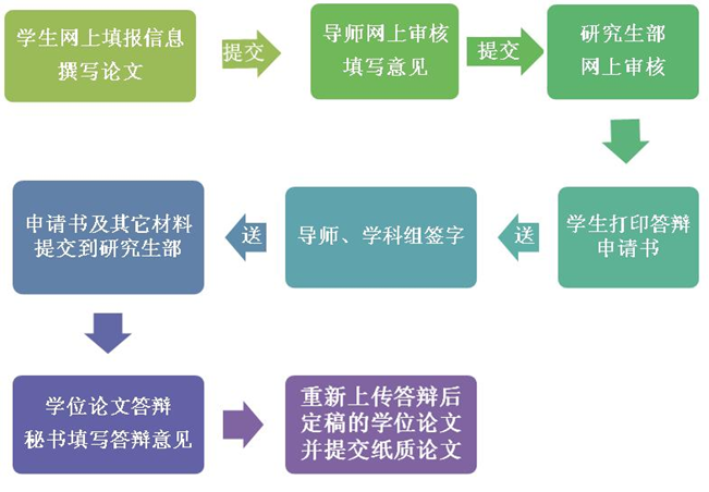 (1)完成答辩的研究生提交《毕业登记表》、《学位论文答辩申请书》(均为一式两份),《论文评阅修改情况表》《论文答辩修改情况表》(均为一式一份)。