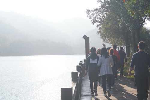 时值深秋的长沙,天空湛蓝,万里无云,研究生们一路欢声笑语,结伴同行,环绕着石燕湖边走边交流,并沿途欣赏美不胜收、如诗如画的湖光景色。