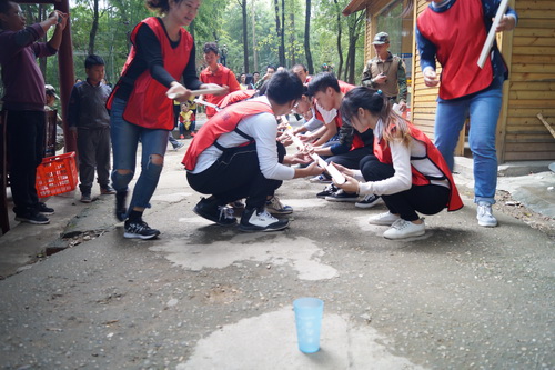 欣赏风景过后,大家参加了开营仪式和素质拓展训练活动。通过“趣味破冰,组建团队”环节以及蹲起报数项目和马莲花开项目,同学们瞬间拉近了距离。接着,进行了深受年轻人欢迎的“丛林穿越”项目。丛林穿越共分A、B、C三条线,共计500米左右,每条线都有不同的探险关卡,同学们换上装备,并选择自己适合的路线进行“穿越”。最后一项训练是“团队竞技”环节,分为乒乓球传递、拉绳接球和传绳子三个项目。各组进行比拼。最快完成的队伍获得胜利,最慢的队伍进行俯卧撑惩罚。